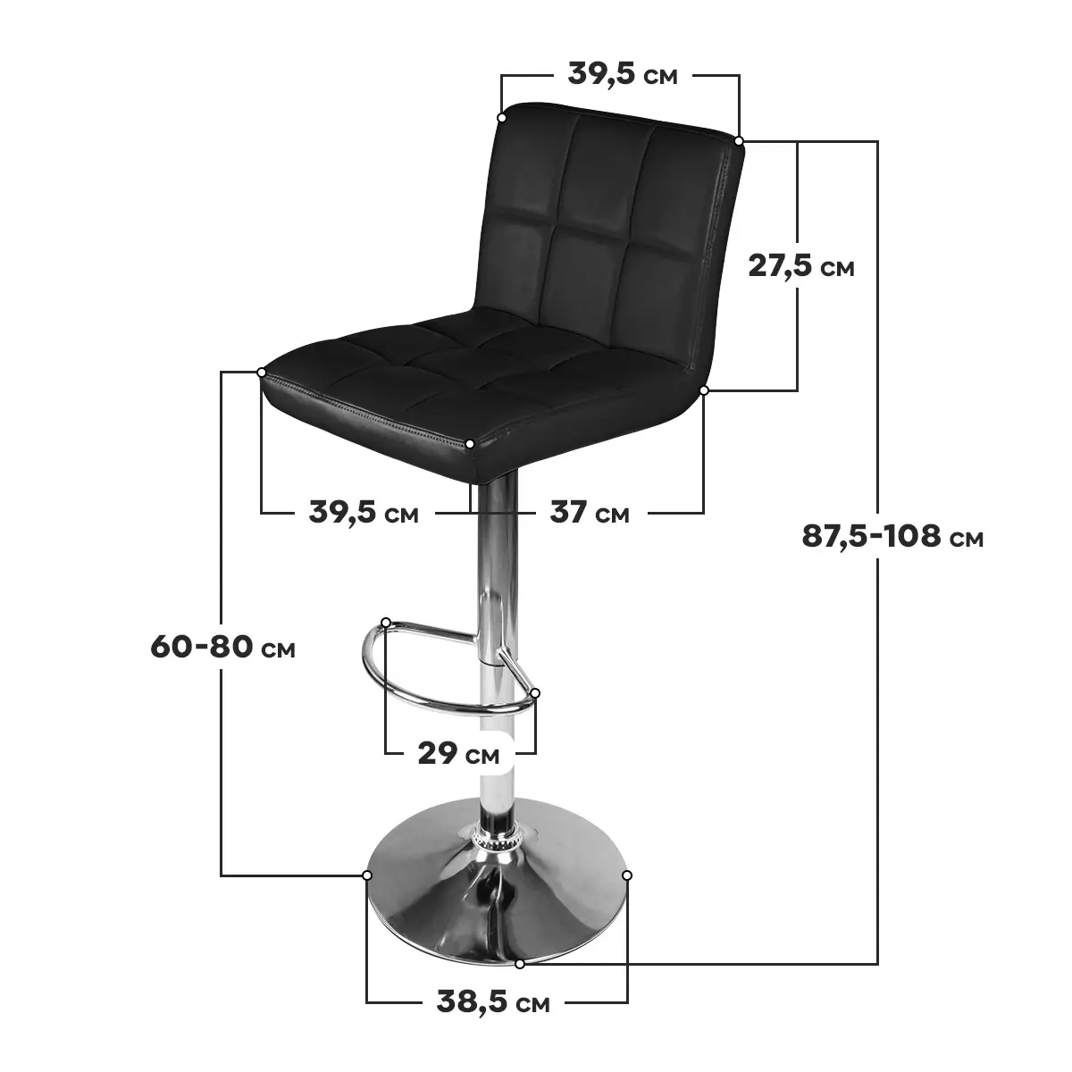 Высота края спинки: 87,5-108 см. Ширина сиденья: 39,5 см. Глубина сиденья: 37 см. Высота сиденья: 60-80 см.